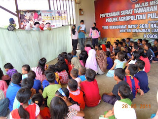 A total of 83 children from PPMS attended the Puppet Show and Exhibition Programme organized by 11 Banggi Youth Club (BYC) members in PPMS Felcra, Batu Layar, Banggi on the 28th May 2011. PPMS, Projek Perumahan Masyarakat Setempat, is a government's initiative aimed to lift targeted families out of poverty and dependence through Agropolitan Project under the responsibility of FELCRA Berhad, Ladang Rakyat, Pulau Banggi.